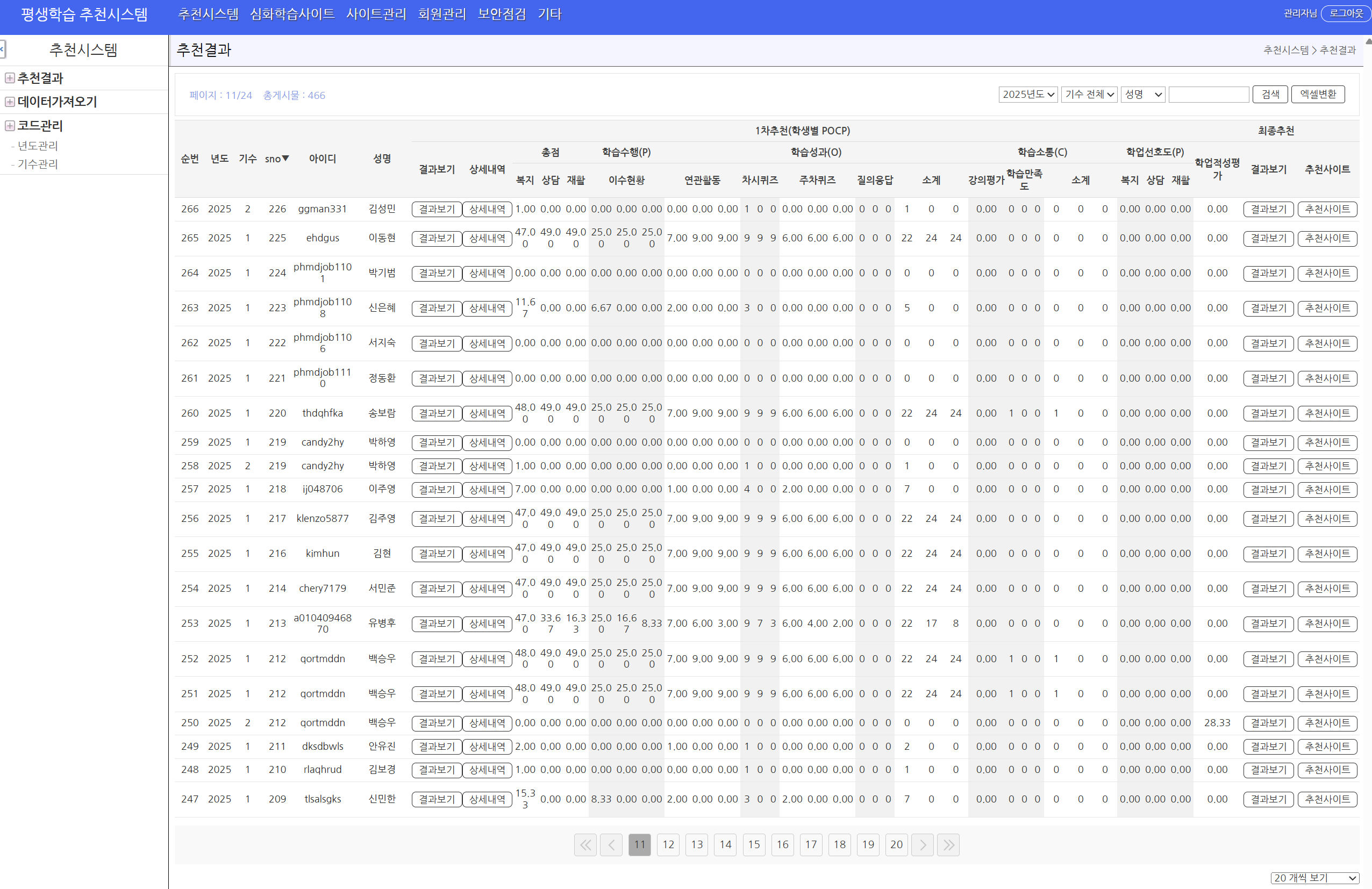 관리자 화면은 시스템 운영 및 추천 결과 확인을 목적으로 활용된다.
