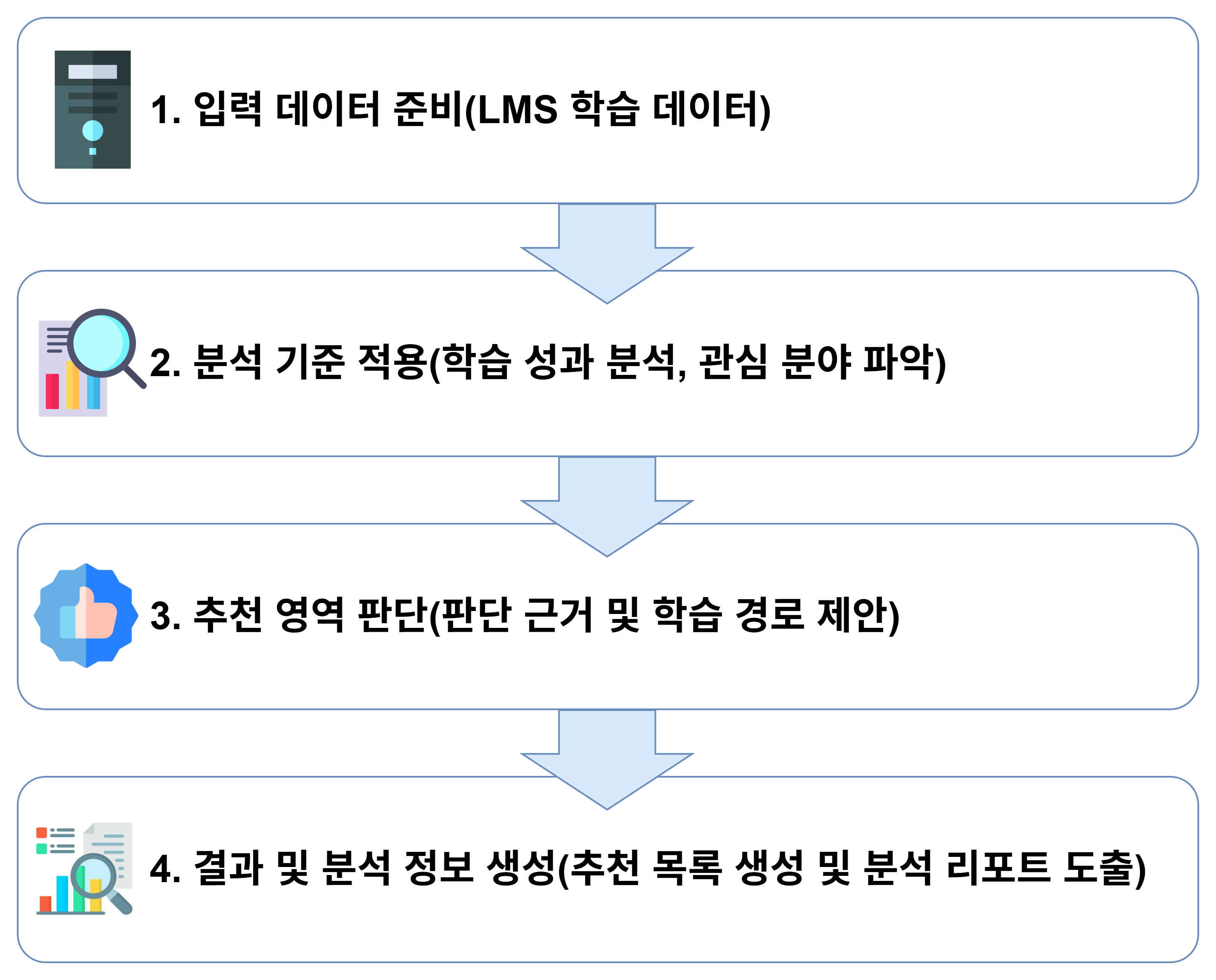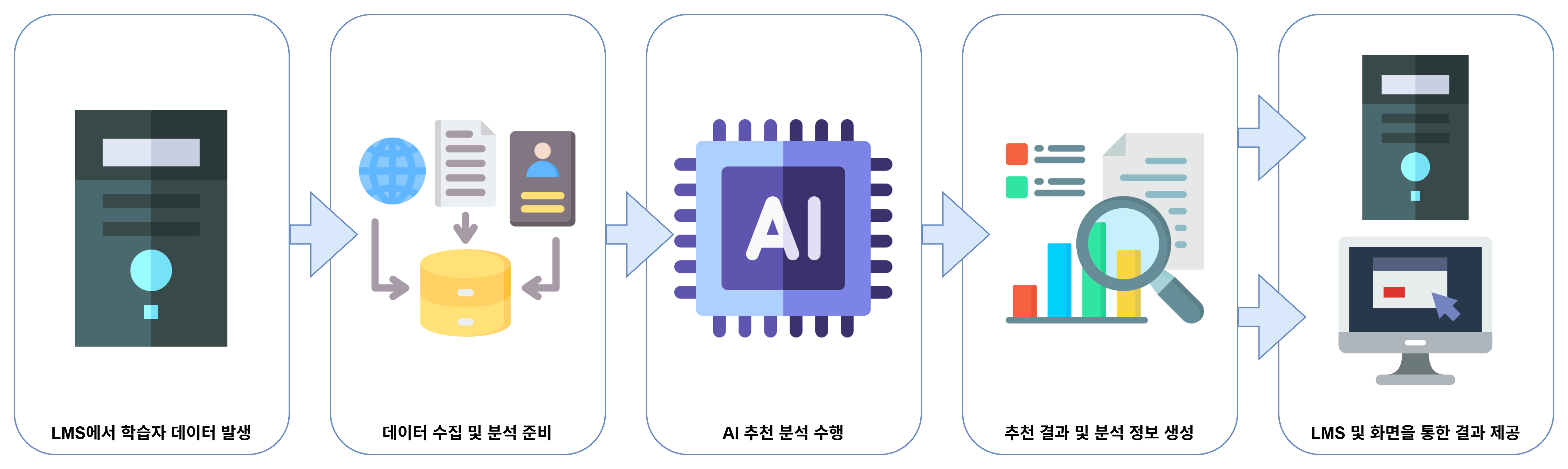 AI 기반 추천 시스템은 LMS 환경과 연동되어 학습 데이터를 수집하고, 이를 분석하여 추천 결과를 생성·제공하는 구조로 설계·구현되었다.