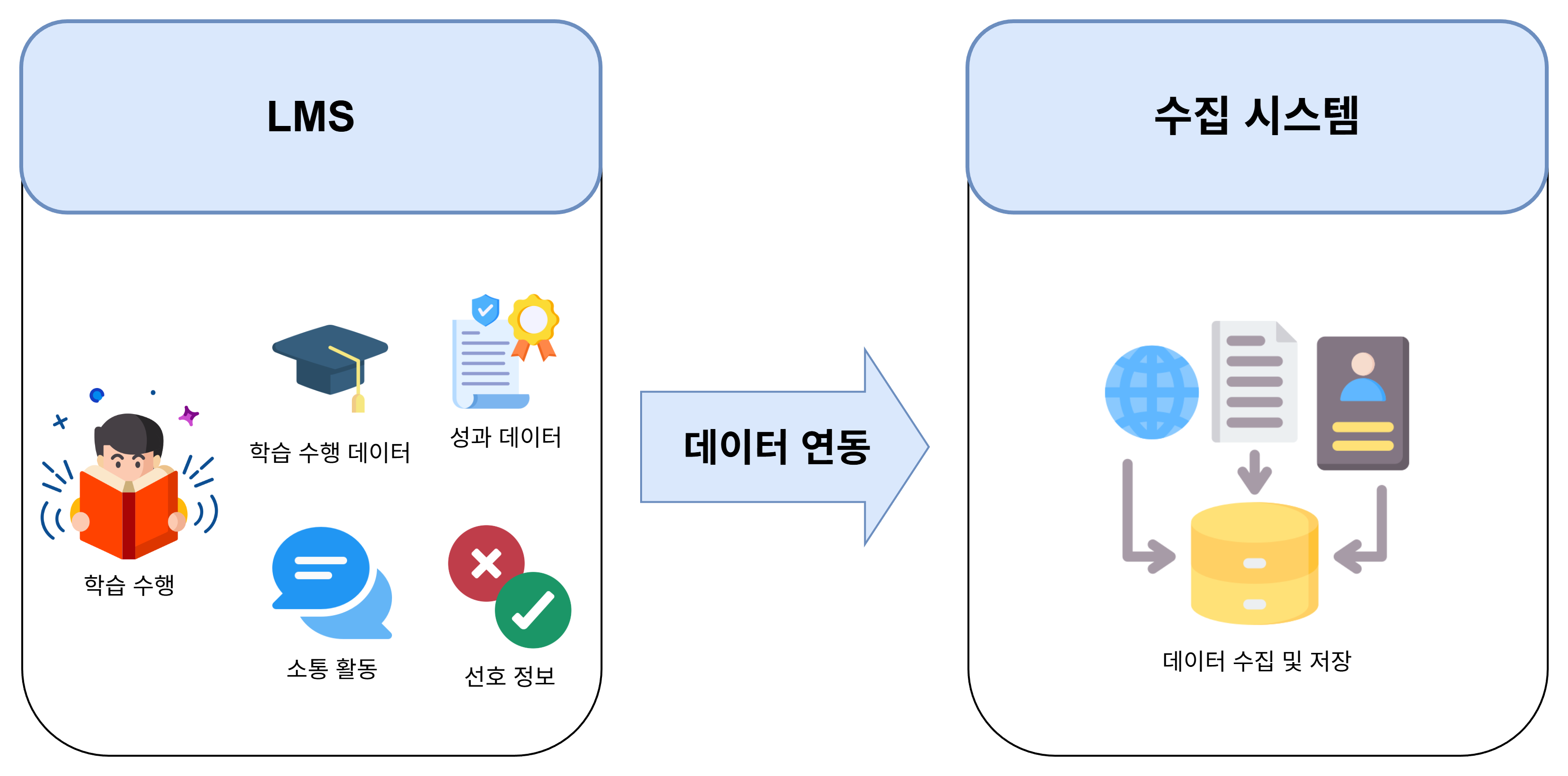 학습자의 학습 수행, 성과, 소통, 선호에 해당하는 데이터는 LMS에서 발생하며, 연동 구조를 통해 시스템으로 전달된다.