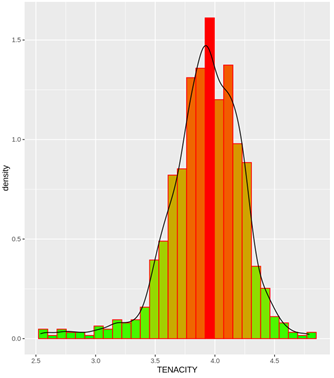 | Tenacity(강도) | 범위 | 단위 | 주 분포 구간 | 미흡 구간 |
