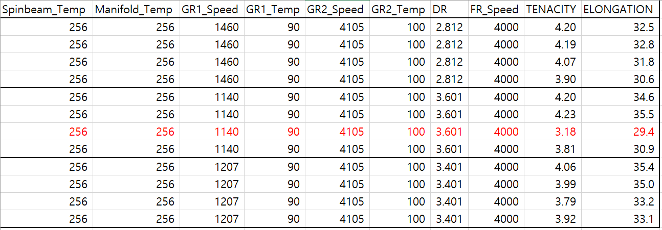 - 주요 방사 공정 변수들의 분포가 적은 범위 구간을 대상으로 수행