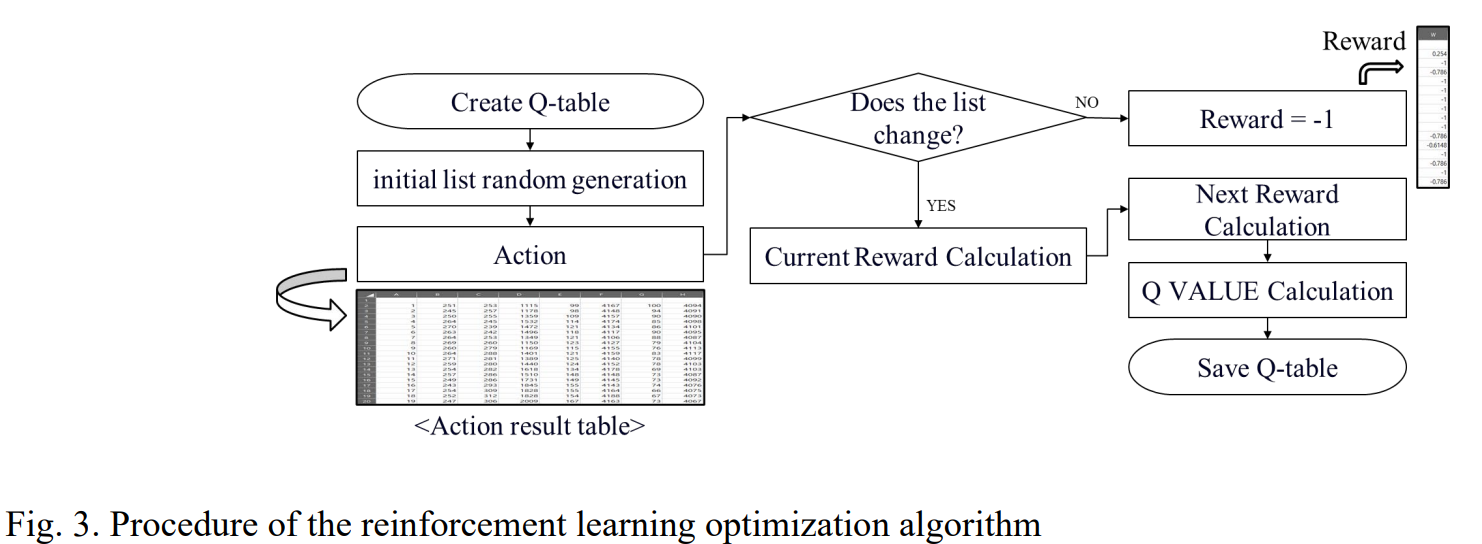 - 핵심 구조/방법: 논문에서 제안한 강화학습 최적화 알고리즘의 절차는 논문의 Figure 3에 시각적으로 표현되어 있다. 알고리즘은 무작위로 생성된 초기 공정 설정 목록에서 시작한다. 이후 행동(Action)을 통해 공정 목록을 변경하고, 변경된 목록에 대한 보상을 계산하여 Q-테이블을 업데이트한다. 보상 계산에는 이전에 구축된 LSTM 회귀 예측 모델이 사용된다.